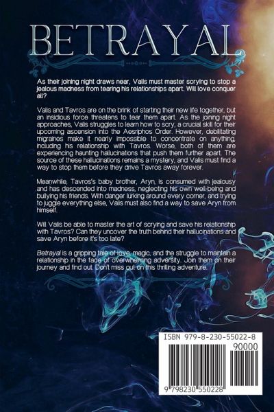 As their joining night draws near, Valis must master scrying to stop a jealous madness from tearing his relationships apart. Will love conquer all? Valis and Tavros are on the brink of starting their new life together, but an insidious force threatens to tear them apart. As the joining night approaches, Valis struggles to learn how to scry, a crucial skill for their upcoming ascension into the Aesriphos Order. However, debilitating migraines make it nearly impossible to concentrate on anything, including his relationship with Tavros. Worse, both of them are experiencing haunting hallucinations that push them further apart. The source of these hallucinations remains a mystery, and Valis must find a way to stop them before they drive Tavros away forever. Meanwhile, Tavros's baby brother, Aryn, is consumed with jealousy and has descended into madness, neglecting his own well-being and bullying his friends. With danger lurking around every corner, and trying to juggle everything else, Valis must also find a way to save Aryn from himself. Will Valis be able to master the art of scrying and save his relationship with Tavros? Can they uncover the truth behind their hallucinations and save Aryn before it's too late? Betrayal is a gripping tale of love, magic, and the struggle to maintain a relationship in the face of overwhelming adversity. Join them on their journey and find out. Don't miss out on this thrilling adventure! Tags: The world is broken, how did he disappear into thin air?, something is screwy with Aryn, Tavros is two-faced, is it pseudodementia (false dementia)?, is it multiple personalities?, Jedai is not Jedai? Tavros loses his marbles, Valis lost his long ago, scrying training is hard when the world Valis knows isn't working the way it's supposed to, will they get married, or won't they get married?, Tavros is considering alternatives, Valis is holding everything together like squeezing a fistful of dry sand while trying to find a bucket, magically induced migraines suck, Tavros is trying, okay?, Thyran knows things but he won't tell, poor Brother Bachris