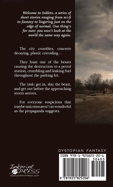The city crumbles, concrete decaying, plastic corroding... They hunt one of the beasts causing the destruction to a petrol station, crumbling and leaking fuel throughout the parking lot. The task: get in, slay the beast, and get out before the approaching storm arrives. For everyone suspicious that maybe unicorns aren't as wonderful as the propaganda suggests. Welcome to Inklets, collectible stand-alone short stories ranging from sci-fi to fantasy to lingering just on the edge of normal. One thing's for sure: you won't look at the world the same way again.