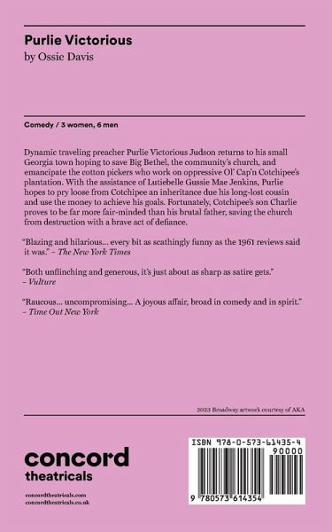 "We still need togetherness; we still need each otherness-with faith in the futureness of our cause. Let us, therefore, stifle the rifle of conflict, shatter the scatter of discord, smuggle the struggle, tickle the pickle, and grapple the apple of peace!" - Purlie Victorious Judson Dynamic traveling preacher Purlie Victorious Judson returns to his small Georgia town hoping to save Big Bethel, the community's church, and emancipate the cotton pickers who work on oppressive Ol' Cap'n Cotchipee's plantation. With the assistance of Lutiebelle Gussie Mae Jenkins, Purlie hopes to pry loose from Cotchipee an inheritance due his long-lost cousin and use the money to achieve his goals. Fortunately, Cotchipee's son Charlie proves to be far more fair-minded than his brutal father, saving the church from destruction with a brave act of defiance.