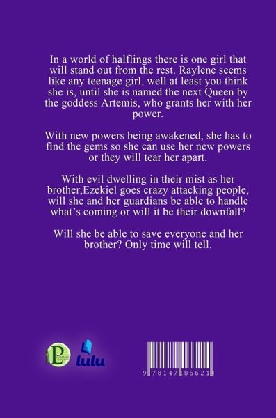 In a world of halflings there is one girl that will stand out from the rest. Raylene seems like any teenage girl, well at least you think she is until she is named the next Queen by the goddess Artemis who grants her with her power. With new powers being awakened she has to find the gems so she can use her new powers or they will tear her apart. With evil dwelling in their mist as her brother, Ezekiel goes crazy attacking people. Will she and her guardians be able to handle what's coming or will it be their downfall. Will she be able to save everyone and her brother? Only time will tell.