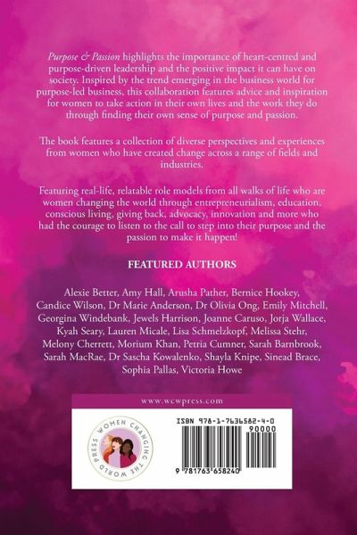 Purpose & Passion highlights the importance of heart-centred and purpose driven leadership and the positive impact it can have on society. Inspired by the trend emerging in the business world for purpose-led business this collaboration features advice and inspiration for women to take action in their own lives and the work they do through finding their own sense of purpose and passion. The book features a collection of diverse perspectives and experiences from women who have created change across a range of fields and industries. Featuring real-life, relatable role-models from all walks of life who are women changing the world through entrepreneurialism, education, conscious living, giving back, advocacy, innovation and more who had the courage to listen to the call to step into their purpose and the passion to make it happen! FEATURED AUTHORS Alexie Better, Amy Hall, Arusha Pather, Bernice Hookey, Candice Wilson, Emily Mitchell, Georgina Windebank, Jewels Harrison, Joanne Caruso, Jorja Wallace, Kyah Seary, Lauren Micale, Lisa Schmelzkopf, Marie Anderson, Melissa Stehr, Molly Fullee, Morium Khan, Dr Olivia Ong, Petria Cumner, Sarah Barnbrook, Sarah Macrae, Sascha Kowalenko, Shayla Knipe, Sinead Brace, Sophia Pallas and Victoria Howe