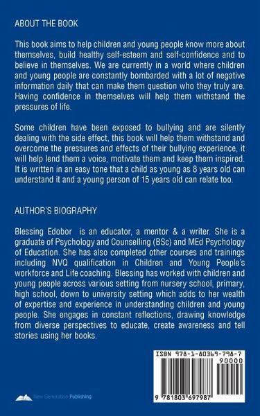This book aims to help children and young people know more about themselves, build healthy self-esteem and self-confidence and to believe in themselves. We are currently in a world where children and young people are constantly bombarded with a lot of negative information daily that can make them question who they truly are. Having confidence in themselves will help them withstand the pressures of life. Some children have been exposed to bullying and are silently dealing with the side effect, this book will help them withstand and overcome the pressures and effects of their bullying experience, it will help lend them a voice, motivate them and keep them inspired. It is written in an easy tone that a child as young as 8 years old can understand it and a young person of 15 years old can relate too.