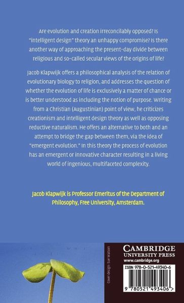 Are evolution and creation irreconcilably opposed? Is 'intelligent design' theory an unhappy compromise? Is there another way of approaching the present-day divide between religious and so-called secular views of the origins of life? Jacob Klapwijk offers a philosophical analysis of the relation of evolutionary biology to religion, and addresses the question of whether the evolution of life is exclusively a matter of chance or is better understood as including the notion of purpose. Writing from a Christian (Augustinian) point of view, he criticizes creationism and intelligent design theory as well as opposing reductive naturalism. He offers an alternative to both and an attempt to bridge the gap between them, via the idea of 'emergent evolution'. In this theory the process of evolution has an emergent or innovative character resulting in a living world of ingenious, multifaceted complexity.