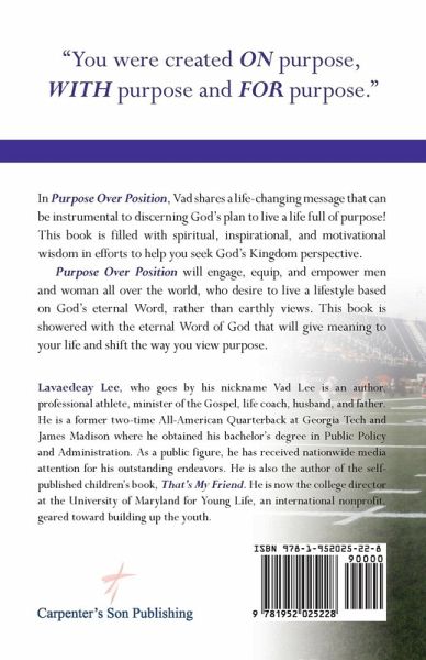 Purpose Over Position is not just a motto to live by, it is a way of life that has the ability to transcend the way we think. This book is comprised of spiritual, inspirational and motivational substance to aid in living your Kingdom Purpose on Earth. Life deserves more than settling for temporary pleasures, titles and mediocracy. It is natural to focus on climbing the corporate ladder on the job, earning a starting position on a sports team, or pursuing financial wealth. However this book brings attention to the supernatural by focusing the perspective on God's Kingdom displayed on Earth. Our positions in life seem to always be at the forefront of our minds, which hinders us from living life more abundantly. This faith-based book is designed to help us live in purpose, on purpose, and with purpose!