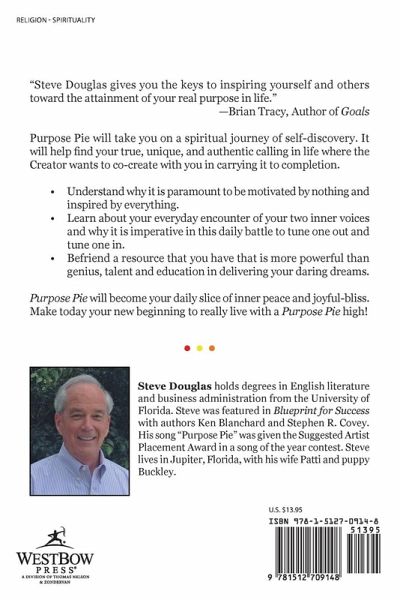 "Steve Douglas gives you the keys to inspiring yourself and others toward the attainment of your real purpose in life." -Brian Tracy, Author of Goals Purpose Pie will take you on a spiritual journey of self-discovery. It will help find your true, unique, and authentic calling in life where the Creator wants to co-create with you in carrying it to completion. ¿ Understand why it is paramount to be motivated by nothing and inspired by everything. ¿ Learn about your everyday encounter of your two inner voices and why it is imperative in this daily battle to tune one out and tune one in. ¿ Befriend a resource that you have that is more powerful than genius, talent and education in delivering your daring dreams. Purpose Pie will become your daily slice of inner peace and joyful-bliss. Make today your new beginning to really live with a Purpose Pie high!