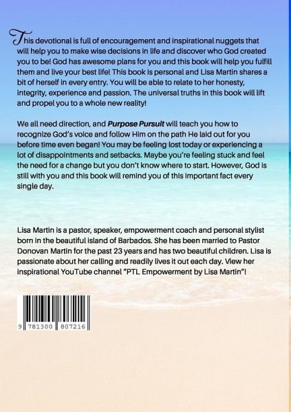 This devotional (Purpose Pursuit: 31 Days of Pursuing God with Passion and Purpose) is full of encouragement and inspirational nuggets that will help you make wise decisions in life and discover who God created you to be! God has awesome plans for you and this book will help you fulfill them and live your best life! This book is personal and Lisa Martin shares a bit of herself in every entry. You will be able to relate to her honesty, integrity, experience and passion. The universal truths in this book will lift and propel you to a whole new reality! We all need direction, and Purpose Pursuit will teach you how to recognize God's voice and follow Him on the path He laid out for you before time even began! You may be feeling lost today or experiencing a lot of disappointments and setbacks. Maybe you're feeling stuck and feel the need for a change but you don't know where to start. However, God is still with you and this book will remind you of this important fact every single day. For even more inspiration view Lisa's YouTube channel: "PTL Empowerment by Lisa Martin" and her Instagram page "@ptlempowerment"!
