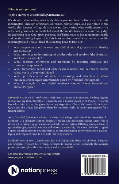 What is your purpose? To find clarity in a world full of distractions? It's about understanding what truly drives you and how to live a life that feels meaningful. Through reflections on values, relationships, and your place in the world, this journey will guide you toward discovering what really matters. It's not about grand achievements but about the small choices you make every day. By exploring your God-given purpose, you'll find ways to live more intentionally and create a lasting impact. Let this book remind you of what makes your life meaningful and unique. Read this exciting book to find out: 1. What empowers youth to overcome addictions and gives sense of identity and meaning? 2. What promotes understanding of gender roles and resolves false feminism and toxic masculinity? 3. What counters extremism and terrorism by fostering inclusive and constructive approach? 4. What transcends racial and caste-based divisions and celebrates unique value, worth of every individual? 5. What provides sense of identity, meaning and direction enabling individuals to navigate uncertainties posed by Artificial intelligence? 6. Why AI singularity and digital sentience cannot change foundational human Purpose?