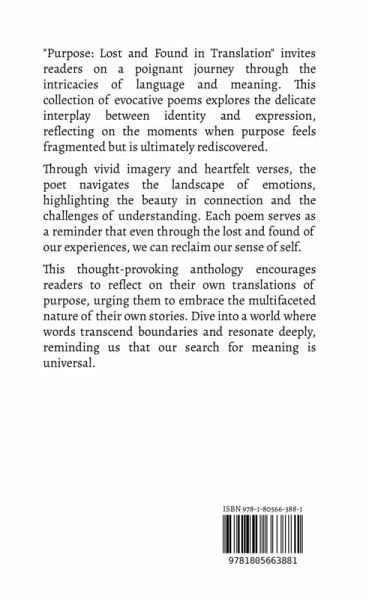 "Purpose: Lost and Found in Translation" invites readers on a poignant journey through the intricacies of language and meaning. This collection of evocative poems explores the delicate interplay between identity and expression, reflecting on the moments when purpose feels fragmented but is ultimately rediscovered. Through vivid imagery and heartfelt verses, the poet navigates the landscape of emotions, highlighting the beauty in connection and the challenges of understanding. Each poem serves as a reminder that even through the lost and found of our experiences, we can reclaim our sense of self. This thought-provoking anthology encourages readers to reflect on their own translations of purpose, urging them to embrace the multifaceted nature of their own stories. Dive into a world where words transcend boundaries and resonate deeply, reminding us that our search for meaning is universal.