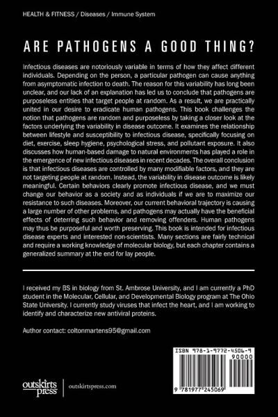 Lifestyle influences infectious disease: This book examines the relationship between lifestyle and infectious disease. Infectious diseases are highly variable in terms of how they affect different individuals, and this book makes the case that differences in lifestyle underlie this variation. More specifically, factors such as poor diet, lack of exercise, poor sleep habits, psychological stress, and exposure to pollution are known to increase one's susceptibility to infection and to increase disease severity. Conversely, healthy lifestyle elements confer disease resistance. Each of the abovementioned lifestyle factors is discussed in detail as it pertains to infectious disease, and the scientific literature on each topic is thoroughly evaluated. The general mechanisms through which these factors alter susceptibility to infection are also considered. Mechanisms include damaging the immune system, damaging barrier defenses (like the skin or lining of the intestine), activating dormant viruses, driving the evolution of more virulent viral strains, and creating cellular microenvironments conducive to infection. Human-environment interactions influence infectious disease: The book also contains a discussion of how human-based damage to the natural environment has promoted the emergence of new infectious diseases. When natural ecosystems are stressed, they undergo alterations in their species composition and species relationships in order to reach a new state of stability. This process also involves the alteration of host-pathogen relationships, which increases the chance that new infectious diseases will enter into human populations from natural reservoirs. By driving widespread extinction, deforestation, pollution, etc., humanity is widely perturbing host-pathogen relationships, and this likely contributes to the increasing rate of disease emergence. Humanity is also creating artificial environments that can increase the burden of infectious disease. Urban environments can make ideal homes for disease-carrying organisms like rodents or bats. Artificialized agricultural settings also put humans in close contact with densely packed animals, which has resulted in many livestock-to-human infectious disease outbreaks in recent decades. Finally, our overcrowded living centers coupled with globalized trade and travel have allowed rapid disease transmission, and this allows localized outbreaks to quickly become global threats. These examples highlight the contribution of artificialization to infectious disease. Overall thesis and conclusions: The central thesis of this book is that infectious diseases are controlled by many modifiable factors, and that we must change our behavior as a society and as individuals if we are to maximize our resistance to these diseases. Additionally, it appears that the behaviors that promote infectious disease also cause many other societal problems. Thus, it is possible that infectious diseases actually serve a valuable role of deterring destructive behaviors and purging society of offenders. Pathogens may thus be purposeful. This book is intended largely for infectious disease experts. Most sections are quite technical, but there is a generalized summary at the end of each chapter for lay people.