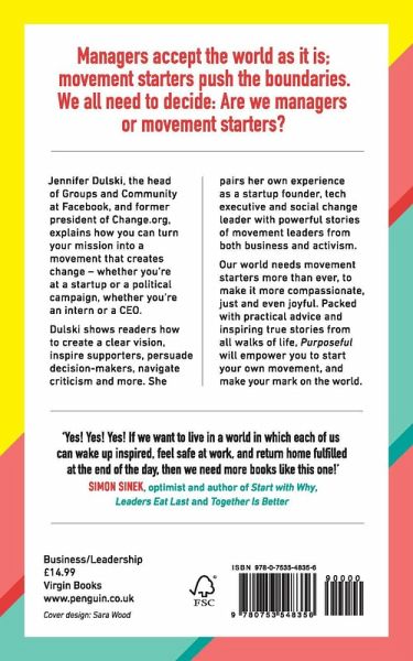 Managers accept the world as it is; movement starters push the boundaries to make it more just compassionate and even joyful. We all need to decide: Are we managers or movement starters? Jennifer Dulski the head of Groups & Community at Facebook and former president of Change.org explains how you can turn your mission into a movement that creates change - whether you're at a startup or a political campaign a Fortune 500 company or a local community group as an intern or a CEO. Anyone can spark change if they believe in the power of taking action no matter where or how small they start. Dulski explains how to create a clear vision inspire supporters persuade decision-makers navigate criticism and more. She pairs her own experience as a startup founder tech executive and social change leader with powerful stories of movement leaders from both business and activism. Our world needs movement starters more than ever. Packed with practical advice and the inspiring true stories of movement starters from all walks of life Purposeful will empower you to start your own movement and make your mark on the world.