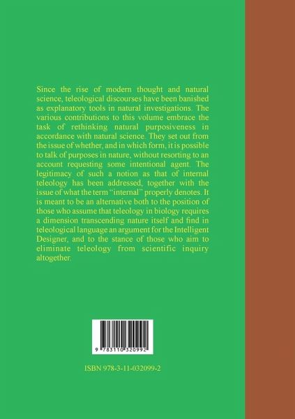 Since the rise of modern thought and natural science, teleological discourses have been banished as explanatory tools in natural investigations. The various contributions to this volume embrace the task of rethinking natural purposiveness in accordance with natural science. They set out from the issue of whether, and in which form, it is possible to talk of purposes in nature, without resorting to an account requesting some intentional agent. The legitimacy of such a notion as that of internal teleology has been addressed, together with the issue of what the term "internal" properly denotes. It is meant to be an alternative both to the position of those who assume that teleology in biology requires a dimension transcending nature itself and find in teleological language an argument for the Intelligent Designer, and to the stance of those who aim to eliminate teleology from scientific inquiry altogether.