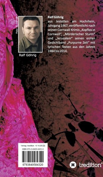 Ralf Göhrig aus Jestetten am Hochrhein, Jahrgang 1967, veröffentlicht nach seinen Cornwall-Krimis Kopflos in Cornwall , Mörderischer Sturm und Jerusalem hiermit seinen ersten Gedichtband Purpurne Zeit mit einer Auswahl lyrischer Texte aus den Jahren 1984 bis 2014. Lyrik hat dabei für den Autor "einen ganz anderen Stellenwert als ein Roman, der lediglich zur Unterhaltung dient", und mancher, auf das Wesentliche reduzierte Gedanke ist sehr persönlicher Natur. Das Gedichtbändchen von Ralf Göhrig enthält 77 lyrische Texte aus 30 Lebensjahren. Kurzweilig zu lesen, findet man sich in dem einen oder…mehr