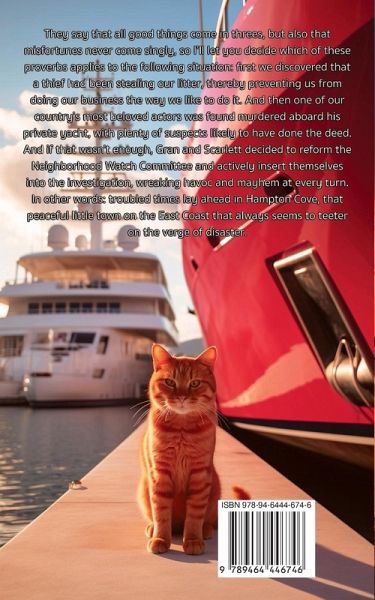 The Spy Who Killed Me They say that all good things come in threes, but also that misfortunes never come singly, so I'll let you decide which of these proverbs applies to the following situation: first we discovered that a thief had been stealing our litter, thereby preventing us from doing our business the way we like to do it. And then one of our country's most beloved actors was found murdered aboard his private yacht, with plenty of suspects likely to have done the deed. And if that wasn't enough, Gran and Scarlett decided to reform the Neighbor¿ hood Watch Committee and actively insert…mehr