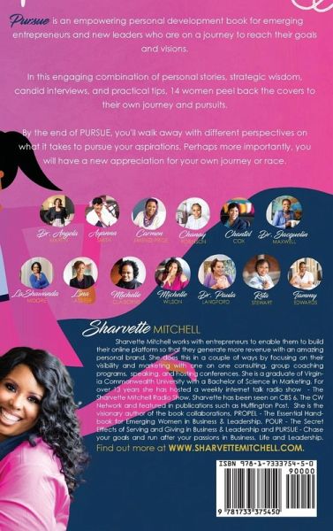 PURSUE is an empowering personal development book for emerging entrepreneurs and new leaders who are on a journey to reach their goals and visions. In this engaging combination of personal stories, strategic wisdom, candid interviews, and practical tips, 14 women peel back the covers to their own journey and pursuits. By the end of PURSUE, you'll walk away with different perspectives on what it takes to pursue your aspirations. Perhaps more importantly, you will have a new appreciation for your own journey or race.