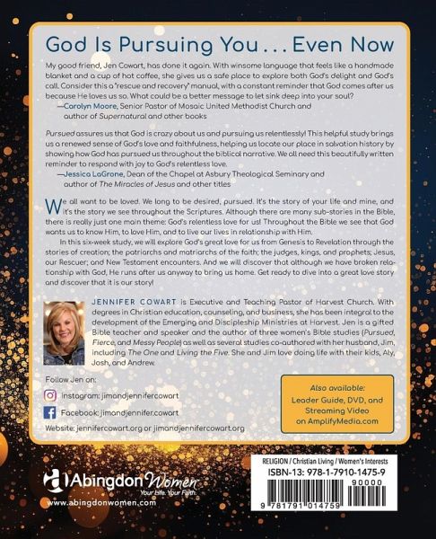 Discover how God is pursuing you as you explore His relentless love from Genesis to Revelation in Pursued by Jennifer Cowart. We all want to be loved. We long to be desired, pursued--whether by a special someone, our friends, or others in our lives. This longing for love and acceptance is the underlying story of many of our lives, and it's the overarching story we see throughout the Scriptures. Although the Bible tells many stories, the main theme is God's relentless love for us. In Pursued, a six-week Bible study by Jennifer Cowart, we will explore God's great love for us from Genesis to Revelation. We will see that God passionately pursues people who do not deserve His love, and we are those people! Like Cain, Abraham, Sarah, Rebekah, David, the woman caught in adultery, Peter, and so many others, we are the ones who have broken relationship with God. But He runs after us anyway to bring us home. In this study, we will explore God's love as evidenced in the stories of creation, the patriarchs, the judges and prophets, Jesus, and the early church. Together we will dive into a great love story and discover that it is our story! Through this study women will: - See the big picture of God's love for them throughout the Scriptures - Discover that God wants a personal relationship with them - Experience God's relentless love for them individually - Realize that God never stops pursuing them Components for this six-week Bible study, each available separately, include a Participant Workbook, a Leader Guide, and video sessions with six 20 to 25-minute segments (with closed captioning).