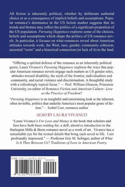 The dominance of popular romance in the US fiction market suggests that its trends and themes may reflect the politics of a significant proportion of the US population. Pursuing Happiness explores some of the choices, beliefs and assumptions which shape the politics of US romance novels. In particular, it focuses on what romances reveal about American attitudes towards work, the West, race, gender, community cohesion, ancestral "roots" and a historical connection (or lack of it) to the land. "Pursuing Happiness explores the ways that popular American romance novels engage such matters as US gender roles, attitudes toward disability, the myth of the frontier, individualism and community, and racial violence and discrimination. A thoughtful study with a refreshingly topical focus." - Professor William Gleason, Princeton University. "An insightful and entertaining look at the inherent, often invisible, politics that underlie America's most popular genre of fiction."- Isobel Carr, romance author