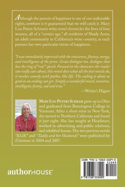 Although the pursuit of happiness is one of our inalienable rights, nowhere is it guaranteed that we will catch it. Mary Lou Peters Schram's witty novel chronicles the lives of four women, all of a "certain age," all residents of Shady Acres, an adult community in California's wine country, as each pursues her own particular vision of happiness.