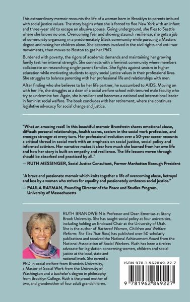 This extraordinary memoir recounts the life of a woman born in Brooklyn to parents imbued with social justice values. The story begins when she is forced to flee New York with an infant and three-year old to escape an abusive spouse. Going underground, she flies to Seattle where she knows no one. Overcoming fear and showing staunch resilience, she gets a job of community organizing in a predominately Black community while pursuing a Masters degree and raising her children alone. She becomes involved in the civil rights and anti-war movements, then moves to Boston to get her PhD. Burdened with poverty, the rigors of academic demands and maintaining her growing family test her internal strength. She connects with a feminist community where members collaborate on researching single-parent families. She fights against sexism in higher education while motivating students to apply social justice values in their professional lives. She struggles to balance parenting with her professional life and relationships with men. After finding who she believes to be her life partner, he succumbed to AIDS. Moving on with her life, she struggles as a dean of a social welfare school with tenured male faculty who try to undermine her. Again, she is resilient and becomes a national and international leader in feminist social welfare. The book concludes with her retirement, where she continues legislative advocacy for social change and justice.