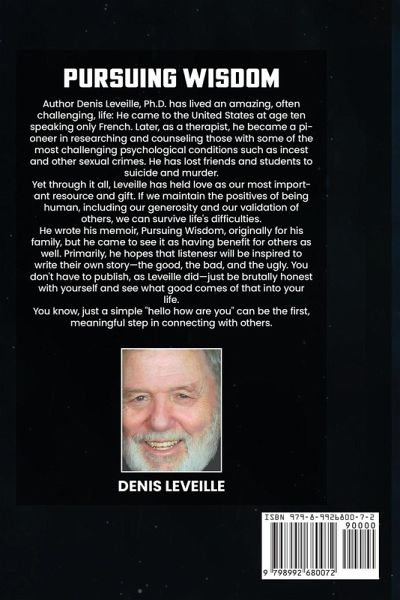 Author Denis Leveille, Ph.D. has lived an amazing, often challenging, life: He came to the United States at age ten speaking only French. Later, as a therapist, he became a pioneer in researching and counseling those with some of the most challenging psychological conditions such as incest and other sexual crimes. He has lost friends and students to suicide and murder. Yet through it all, Leveille has held love as our most important resource and gift. If we maintain the positives of being human, including our generosity and our validation of others, we can survive life's difficulties. He wrote his memoir, Pursuing Wisdom, originally for his family, but he came to see it as having benefit for others as well. Primarily, he hopes that readers will be inspired to write their own story-the good, the bad, and the ugly. You don't have to publish, as Leveille did-just be brutally honest with yourself and see what good comes of that into your life. You know, just a simple "hello how are you" can be the first, meaningful step in connecting with others.