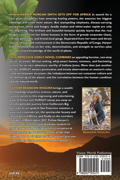 This is the newly-revised 2nd Edition! One tiny plant in the congo with the power to change everything One brave woman’s quest to find it and save it When Harper Morgan Smith sets off for Africa to search for a rare plant thought to have amazing healing powers, she assumes her biggest challenge will come from nature. But stampeding elephants, disease-carrying mosquitoes, thirst and hunger, deadly snakes and white-water rapids are only the beginning. The beautiful and brilliant botanist quickly learns that the real danger comes from her fellow humans in the form of greedy corporate titans, corrupt politicians and brutal local gangs. Separated from her team and thrust into an inhospitable environment in the Democratic Republic of the Congo, Harper finds she must rely on her wits, determination and strength to survive—plus her specialized knowledge of the world of plants. This impressive debut novel by Brandon Wiggins combines an appealing heroine, non-stop action, an exotic African setting, whip-smart humor, romance and fascinating science for an epic adventure worthy of Indiana Jones. More than just another thriller, Pursuit weaves provocative and timely observations on women’s roles in the world power structure, the imbalance between our consumer culture and the well-being of the planet, and the correlation between the human condition and the natural world. Author Brandon Wiggins brings a wealth of knowledge of politics, science, nature and current events to this engrossing and entertaining work of fiction. Let Pursuit sweep you away on an unforgettable journey from California’s Big Sur coast to an opulent San Francisco mansion, a luxurious corporate jet, the spectacular beauty and infinite peril of Africa, and finally to the corridors of power in Washington, D.C. Harper's transformation from naïve graduate student to confident woman battling ruthless corruption at the highest level. Pursuit is a special tale that will keep you up all night reading—and will give you something to think about for long afterwards.