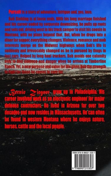 Pursuit is a story of adventure, intrigue and, yes, love. Bob Stehling is at loose ends. With his long marriage finished and his career ended by corporate downsizing, he pulls up roots and sets out, driving west in his truck camper to visit his cousin in Montana, with no plans beyond that. But, when he drops into a diner for supper, everything changes. Violence, romance and mob interests merge on the Midwest highways when Bob's life is suddenly and irrevocably changed as he is pursued by thugs in fast cars. Helped by long haul truckers, Bob avoids one calamity only to find violence and danger when he arrives at Timberline Ranch. Yet, a new purpose and value for life gives Bob the strength to fight for those he comes to care for.