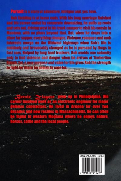 Pursuit is a story of adventure, intrigue and, yes, love. Bob Stehling is at loose ends. With his long marriage finished and his career ended by corporate downsizing, he pulls up roots and sets out, driving west in his truck camper to visit his cousin in Montana, with no plans beyond that. But, when he drops into a diner for supper, everything changes. Violence, romance and mob interests merge on the Midwest highways when Bob's life is suddenly and irrevocably changed as he is pursued by thugs in fast cars. Helped by long haul truckers, Bob avoids one calamity only to find violence and danger when he arrives at Timberline Ranch. Yet, a new purpose and value for life gives Bob the strength to fight for those he comes to care for.