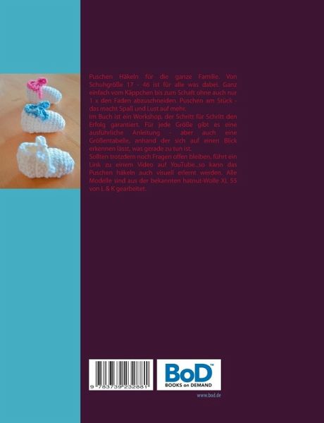 Puschen Häkeln für die ganze Familie. Von Schuhgröße 17 - 46 ist für alle was dabei. Ganz einfach vom Käppchen bis zum Schaft ohne auch nur 1 x den Faden abzuschneiden. Puschen am Stück - das macht Spaß und Lust auf mehr.Im Buch ist ein Workshop, der Schritt für Schritt den Erfolg garantiert. Für jede Größe gibt es eine ausführliche Anleitung - aber auch eine Größentabelle, anhand der sich auf einen Blick erkennen lässt, was gerade zu tun ist. Sollten trotzdem noch Fragen offen bleiben, führt ein Link zu einem Video auf YouTube...so kann das Puschen häkeln auch visuell erlernt werden. Alle Modelle sind aus der bekannten hatnut-Wolle XL 55 von L & K gearbeitet - sie ist im Fachhandel & Internet erhältlich.