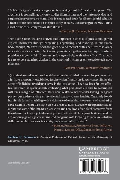 Today's presidents enter office having campaigned on an ambitious policy agenda, eager to see it enacted, and willing to push so that it is. The central question of presidents' legislative leadership, therefore, is not a question of resolve, it is a question of strategy: by what means can presidents build winning coalitions for their agenda? Pushing the Agenda uncovers the answer. It reveals the predictable nature of presidents' policy making opportunities and the systematic strategies White House officials employ to exploit those opportunities. Drawing on an eclectic array of original evidence - spanning presidents from Dwight Eisenhower to George W. Bush and issues ranging from education to energy, and healthcare to taxes - Matthew N. Beckmann finds modern presidents' influence in Congress is real, often substantial, and - to date - largely underestimated.
