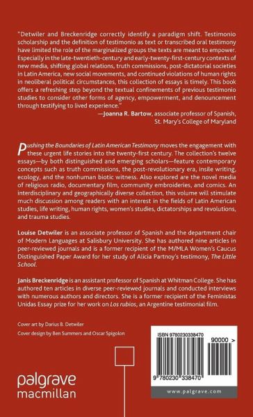 'Detwiler and Breckenridge correctly identify a paradigm shift. Testimonio scholarship and the definition of testimonio as text or transcribed oral testimony have limited the role of marginalized groups the texts are meant to empower. Especially in the late-20th-century and early-21st-century contexts of new media, shifting global relations, truth commissions, post-dictatorial societies in Latin America, new social movements, and continued violations of human rights in neoliberal political circumstances, this collection of essays is timely. This book offers a refreshing step beyond the textual confinements of previous testimonio studies to consider other forms of agency, empowerment and denouncement through testifying to lived experience.'