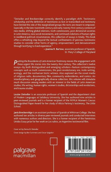 'Detwiler and Breckenridge correctly identify a paradigm shift. Testimonio scholarship and the definition of testimonio as text or transcribed oral testimony have limited the role of marginalized groups the texts are meant to empower. Especially in the late-20th-century and early-21st-century contexts of new media, shifting global relations, truth commissions, post-dictatorial societies in Latin America, new social movements, and continued violations of human rights in neoliberal political circumstances, this collection of essays is timely. This book offers a refreshing step beyond the textual confinements of previous testimonio studies to consider other forms of agency, empowerment and denouncement through testifying to lived experience.'