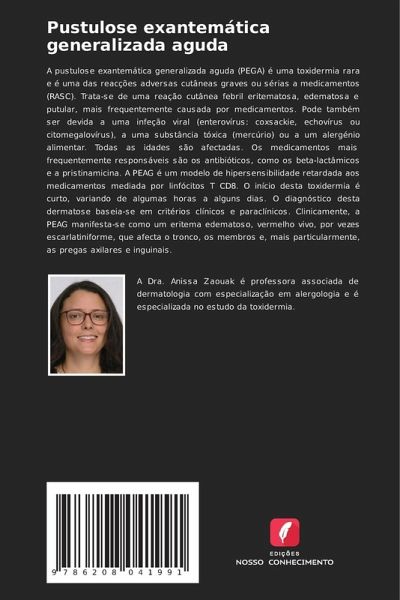 A pustulose exantemática generalizada aguda (PEGA) é uma toxidermia rara e é uma das reacções adversas cutâneas graves ou sérias a medicamentos (RASC). Trata-se de uma reação cutânea febril eritematosa, edematosa e putular, mais frequentemente causada por medicamentos. Pode também ser devida a uma infeção viral (enterovírus: coxsackie, echovírus ou citomegalovírus), a uma substância tóxica (mercúrio) ou a um alergénio alimentar. Todas as idades são afectadas. Os medicamentos mais frequentemente responsáveis são os antibióticos, como os beta-lactâmicos e a pristinamicina. A PEAG é um modelo de hipersensibilidade retardada aos medicamentos mediada por linfócitos T CD8. O início desta toxidermia é curto, variando de algumas horas a alguns dias. O diagnóstico desta dermatose baseia-se em critérios clínicos e paraclínicos. Clinicamente, a PEAG manifesta-se como um eritema edematoso, vermelho vivo, por vezes escarlatiniforme, que afecta o tronco, os membros e, mais particularmente, as pregas axilares e inguinais.