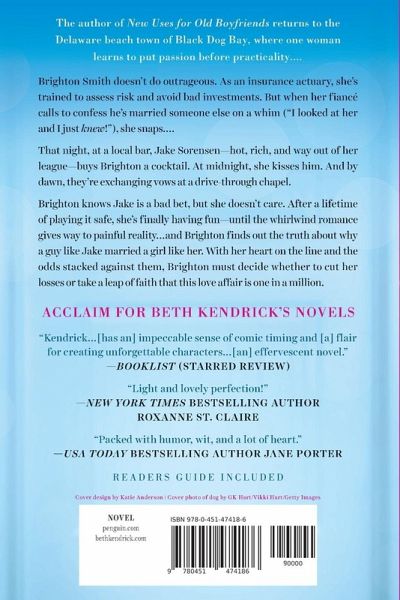 The author of Once Upon a Wine returns to the Delaware seashore town of Black Dog Bay, where one woman learns to put passion before practicality… Brighton Smith doesn't do outrageous. As an insurance actuary, it's her job to assess risk and avoid bad investments. But when her fiancé calls to confess he's married someone else on a whim ("I looked at her and I just knew!"), she snaps... That night, at a local bar, Jake Sorensen-hot, rich, and way out of her league-buys Brighton a cocktail. At midnight, she kisses him. And by dawn, they're exchanging vows at a drive-through chapel. Brighton knows Jake is a bad bet, but she doesn't care. After a lifetime of playing it safe, she's finally having fun. Until the whirlwind romance gives way to painful reality...and Brighton finds out the truth about why a guy like Jake married a girl like her. With her heart on the line and the odds stacked against them, Brighton must decide whether to cut her losses or take a leap of faith that this love affair is one in a million. INCLUDES A READERS GUIDE