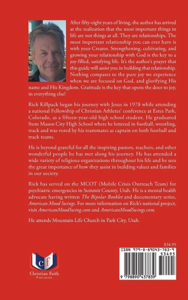 After fifty-eight years of living, the author has arrived at the realization that the most important things in life are not things at all. They are relationships. The most important relationship you can ever have is with your Creator. Strengthening, cultivating, and growing your relationship with God is the key to a joy-filled, satisfying life. It's the author's prayer that this guide will assist you in building that relationship. Nothing compares to the pure joy we experience when we are focused on God, and glorifying His name and His Kingdom. Gratitude is the key that opens the door to joy, in everything else! Rick Killpack began his journey with Jesus in 1978 while attending a national Fellowship of Christian Athletes' conference at Estes Park, Colorado, as a fifteen-year-old high school student. He graduated from Mason City High School where he lettered in football, wrestling, track and was voted by his teammates as captain on both football and track teams. He is beyond grateful for all the inspiring pastors, teachers, and other wonderful people he has met along his journey. He has attended a wide variety of religious organizations throughout his life and he sees the great importance of how they assist in building values and families in our society. Rick has served on the MCOT (Mobile Crisis Outreach Team) for psychiatric emergencies in Summit County, Utah. He is a mental health advocate having written The Bipolar Booklet and documentary series, American Mood Swings. For more information on Rick's national project, visit AmericanMoodSwing.com and AmericanMoodSwings.com. He attends Mountain Life Church in Park City, Utah.