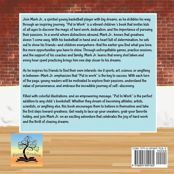 Join Mark Jr., a spirited young basketball player with big dreams, as he dribbles his way through an inspiring journey. "Put in Work" is a vibrant children's book that invites kids of all ages to discover the magic of hard work, dedication, and the importance of pursuing their passions. In a world where distractions abound, Mark Jr., knows that greatness doesn't come easy. With his basketball in hand and a heart full of determination, he sets out to show his friends-and children everywhere-that the earlier you find what you love, the more opportunities you have to shine. Through unforgettable games, practice sessions, and the support of his coaches and family, Mark Jr. learns that every shot taken and every hour spent practicing brings him one step closer to his dreams. As he inspires his friends to find their own interests-be it sports, art, science, or anything in between-Mark Jr. emphasizes that "Put in work" is the key to success. With each turn of the page, young readers will be motivated to explore their passions, understand the value of perseverance, and embrace the incredible journey of self-discovery. Filled with colorful illustrations, and an empowering message, "Put In Work" is the perfect addition to any child's bookshelf. Whether they dream of becoming athletes, artists, scientists, or anything else, this book encourages them to believe in themselves and take the first steps toward greatness. Get ready to lace up your sneakers, grab your favorite hobby, and join Mark Jr. on an exciting adventure that celebrates the joy of hard work and the thrill of chasing dreams.