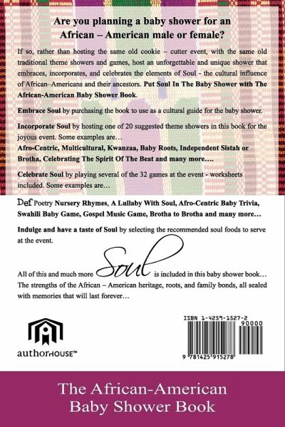 Are you planning a baby shower for an African - American male or female? If so, rather than hosting the same old cookie - cutter event, with the same old traditional theme showers and games, host an unforgettable and unique shower that embraces, incorporates, and celebrates the elements of Soul - the cultural influence of African-Americans and their ancestors. Put Soul In The Baby Shower with The African American Baby Shower Book. Embrace Soul by purchasing the book to use as a cultural guide for the baby shower. Incorporate Soul by hosting one of 20 suggested theme showers in this book for the joyous event. Some examples are. Afro-centric, Multicultural, Kwanzaa, Baby Roots, Independent Sistah or Brotha, Celebrating The Spirit Of The Beat and many more.. Celebrate Soul by playing several of the 32 games at the event - worksheets included. Some examples are. Def Poetry Nursery Rhymes, A Lullaby With Soul, Afro-centric Baby Trivia, Swahili Baby Game, Gospel Music Game, Brotha to Brotha and many more. Indulge and have a taste of Soul by selecting the recommended soul foods to serve at the event. All of this and much more Soul is included in this baby shower book.The strengths of the African - American heritage, roots, and family bonds, all sealed with memories that will last forever.