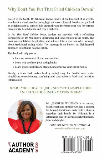 WHY DON'T YOU PUT THAT FRIED CHICKEN DOWN? Raised in the South, Dr. Whitmon knows food is at the forefront of all events, whether it is a backyard barbecue, high hat tea or funeral. Southern-style food as delicious as it is, some of it is unhealthy and increases your risk for chronic diseases like heart disease and type 2 diabetes. In Put That Fried Chicken Down, readers are provided with a refreshing perspective on Dr. Whitmon's upbringing and food choices in the South. The book weaves biblical inspiration and science into a much-needed message about traditional eating habits. The message is an honest approach to faith and healthy eating. This book will help you to: · Increase awareness of your current diet. · Learn why you have poor eating habits. · Learn practical skills, and strategies to improve your eating habits. Finally, a book that makes healthy eating easy for Southerners, while simplifying overwhelming, confusing and contradictory food, and nutrition information! Start your health journey with simple food and nutrition information today!