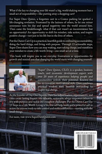 What if the smallest actions could create the biggest changes in your life? In Put the Damn Cart Up: 13 Steps to a Life Worth Living, Super Dave Quinn shares a life-changing revelation that started with a shopping cart in a Costco parking lot. This isn't your typical self-help book-it's a powerful, no-nonsense guide to taking ownership of your life and creating real, lasting change. Through 13 actionable steps, you'll learn how to: Overcome setbacks and excuses that hold you back. Turn everyday frustrations into opportunities for growth. Align your actions with your purpose and values. Make a positive impact-on yourself and the world around you. Drawing from his own experiences as a coach, leader, and speaker, Super Dave offers relatable stories and practical strategies to help you stop waiting for the "perfect moment" and start living with intention. If you're ready to stop procrastinating, embrace the hard things, and finally build a life of substance, this book is your blueprint. Perfect for readers of personal growth, self-help, and motivational books, Put the Damn Cart Up will inspire you to see everyday challenges in a whole new light. Take the first step-because changing the world starts with changing yourself.