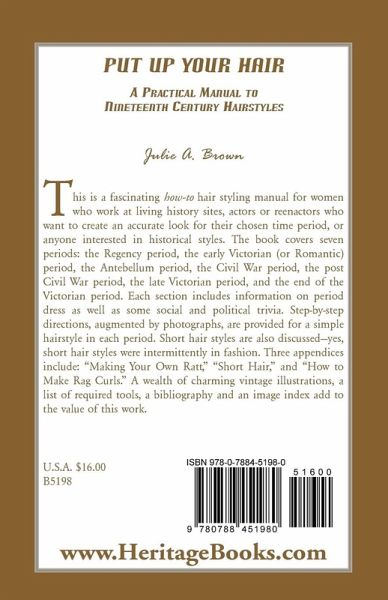 This is a fascinating how-to hair styling manual for women who work at living history sites, actors or reenactors who want to create an accurate look for their chosen time period, or anyone interested in historical styles. The book covers seven periods: the Regency period, the early Victorian (or Romantic) period, the Antebellum period, the Civil War period, the post Civil War period, the late Victorian period, and the end of the Victorian period. Each section includes information on period dress as well as some social and political trivia. Step-by-step directions, augmented by photographs, are provided for a simple hairstyle in each period. Short hair styles are also discussed-yes, short hair styles were intermittently in fashion. Three appendices include: "Making Your Own Ratt," "Short Hair," and "How to Make Rag Curls." A wealth of charming vintage illustrations, a list of required tools, a bibliography and an image index add to the value of this work.