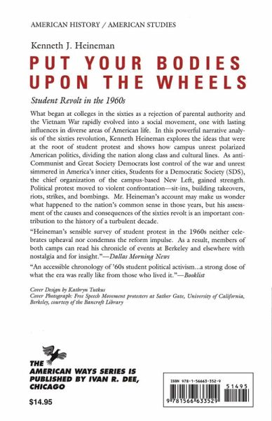 What began at colleges in the sixties as a rejection of parental authority and the Vietnam War rapidly evolved into a social movement, one with lasting influences in diverse areas of American life. As anti-Communist and Great Society Democrats lost control of the Vietnam War and the unrest in America's inner cities, Students for a Democratic Society (SDS), the chief organization of the campus-based New Left, gained strength, ending the decade with 100,000 members. From political protest, SDS and its faculty and intellectual allies moved to violent confrontation with university and government officials. Sit-ins, building takeovers, riots, and strikes hit more than 300 of the nation's 2,000 campuses in the 1960s. Between January 1969 and April 1970, young radicals bombed 5,000 police stations, corporate offices, military facilities, and campus buildings. Twenty-six thousand students were arrested and thousands injured or expelled while engaged in protest activities. Meanwhile 57,000 youths, many of whom lacked the financial means to attend college and secure draft deferments, died in Vietnam. Against a backdrop of student protest, the campus drug culture blossomed. In Put Your Bodies Upon the Wheels (a quote from Free Speech leader Mario Savio), Mr. Heineman plays no favorites in indicting foolishness and absurdity on both left and right. While his account may make us wonder what happened to our common sense in those years, his assessment of the causes and consequences of the sixties revolt is impossible to evade. "Heineman's sensible survey of student protest in the 1960s neither celebrates upheaval nor condemns the reform impulse. As a result, members of both camps can read his chronicle of events at Berkeley and elsewhere with nostalgia and for insight."-Dallas Morning News.