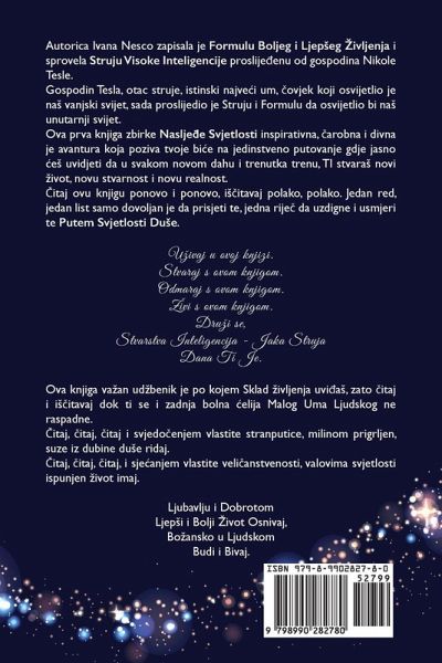 Autorica Ivana Nesco zapisala je Formulu Boljeg i Ljep¿eg ¿ivljenja i sprovela Struju Visoke Inteligencije proslije¿enu od gospodina Nikole Tesle. Gospodin Tesla, otac struje, istinski najve¿i um, ¿ovjek koji osvijetlio je nä vanjski svijet, sada proslijedio je Struju i Formulu da osvijetlio bi nä unutarnji svijet. Ova prva knjiga zbirke Naslje¿e Svjetlosti inspirativna, ¿arobna i divna je avantura koja poziva tvoje bi¿e na jedinstveno putovanje gdje jasno ¿e¿ uvidjeti da u svakom novom dahu i trenutka trenu, TI stvarä novi ¿ivot, novu stvarnost i novu realnost. Nikola Tesla Speaks. Author Ivana Nesco has written The Formula for Better and More Beautiful Living, and implemented The Current of High Intelligence, transmitted by Mr. Nikola Tesla. Mr. Tesla, the father of electricity, truly the greatest mind, the man who lit up our outer world, now passes on The Current and The Formula to illuminate our inner world. This first book of The Legacy of Light collection is an inspiring, magical, and delightful adventure that invites your Being on a unique journey where you will clearly see that, in every new breath and the moment of the moment, YOU are creating a new life and a new reality.