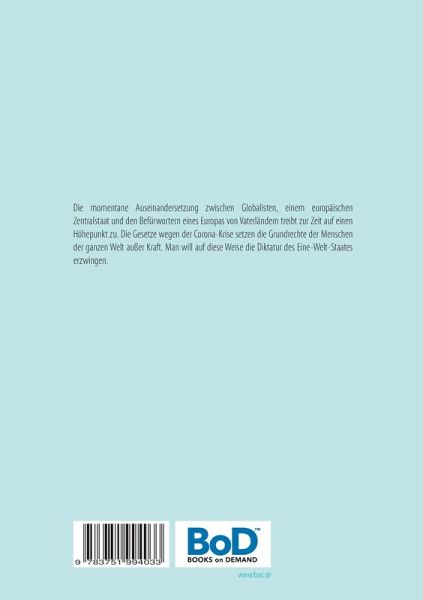 Die momentane Auseinandersetzung zwischen Globalisten, einem europäischen Zentralstaat und den Befürwortern eines Europas von Vaterländern treibt zur Zeit auf einen Höhepunkt zu. Die Gesetze wegen der Corona-Krise setzen die Grundrechte der Menschen der ganzen Welt außer Kraft. Man will auf diese Weise die Diktatur des Eine-Welt-Staates erzwingen.
