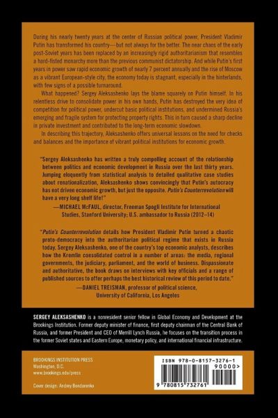 How Putin's autocracy undercut Russia's economy and chances for democracy During his nearly twenty years at the center of Russian political power, Vladimir Putin has transformed the vast country in many ways, not all of them for the better. The near-chaos of the early post-Soviet years has been replaced by an increasingly rigid authoritarianism, resembling a hard-fisted monarchy more than the previous communist dictatorship. Putin's early years in power saw rapid economic growth, averaging nearly 7 percent annually, and the rise of Moscow as a vibrant European-style city. But a slowdown during the second half of Putin's administration, since 2009, has resulted in the stagnation of the economy, especially in the hinterlands, with few signs of a possible turnaround. What accounted for these changes in Russia? Sergey Aleksashenko, a former top Russian finance official and then private businessman, lays the blame squarely on Putin himself, even more than external factors such as the sharp fall in oil prices or Western sanctions after Russia's annexation of Crimea in 2014. In his relentless drive to consolidate power in his own hands, Aleksashenko writes, Putin has destroyed the very idea of competition for political power. He has done so by systematically undercutting basic political institutions of the post-Soviet Russian state, including independent power centers such as the parliament, the judiciary, and a free media. In the economic realm, Putin effectively undermined Russia's still-emerging and very fragile system for protecting property rights-the basis of all economic activity. This in turn caused a sharp decline in private investment and thus contributed to the long-term economic slowdown. One result of Putin's rule was the destruction of the emerging checks and balances system in Russia, and that would be a major problem for Russia if and when it decides to become a "normal" democratic country based on Western values. In describing how all this happened, Aleksashenko's book offers universal lessons in the necessity of checks and balances in any political system-as well as in the importance of vibrant political institutions for economic growth.
