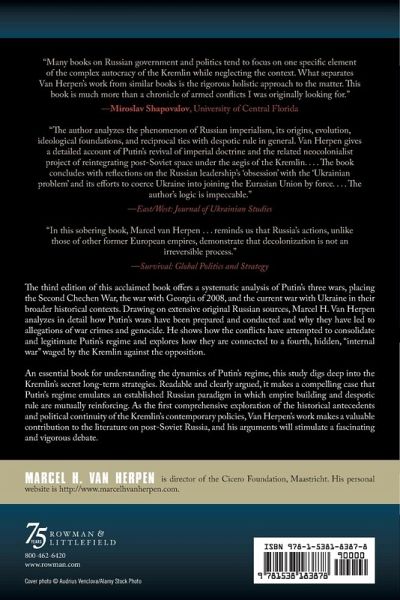 This fully updated book offers the first systematic analysis of Putin's three wars, placing the Second Chechen War, the war with Georgia of 2008, and the war with Ukraine in their broader historical context. Drawing on extensive original Russian sources, Marcel H. Van Herpen analyzes in detail how Putin's wars were prepared and conducted, and why they led to allegations of war crimes and genocide. He shows how the conflicts functioned to consolidate and legitimate Putin's regime and explores how they were connected to a fourth, hidden, "internal war" waged by the Kremlin against the opposition. The author convincingly argues that the Kremlin-relying on the secret services, the Orthodox Church, the Kremlin youth "Nashi," and the rehabilitated Cossacks-is preparing for an imperial revival, most recently in the form of a "Eurasian Union." An essential book for understanding the dynamics of Putin's regime, this study digs deep into the Kremlin's secret long-term strategies. Readable and clearly argued, it makes a compelling case that Putin's regime emulates an established Russian paradigm in which empire building and despotic rule are mutually reinforcing. As the first comprehensive exploration of the historical antecedents and political continuity of the Kremlin's contemporary policies, Van Herpen's work will make a valuable contribution to the literature on post-Soviet Russia, and his arguments will stimulate a fascinating and vigorous debate.