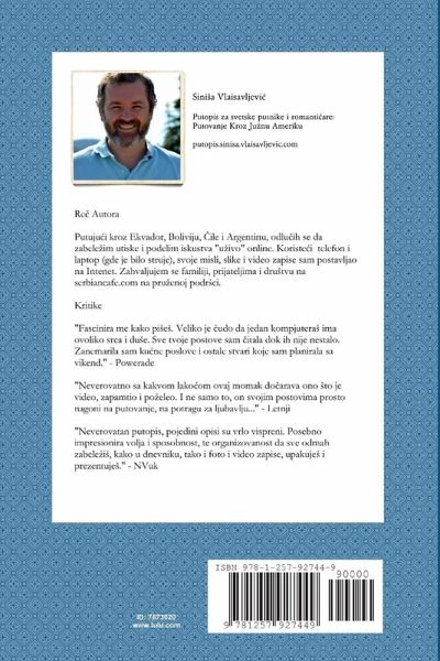 Putopis - Ekvador Bolivija ¿ile Argentina Putopis za svetske putnike i romanti¿are. Putovanje kroz Junu Ameriku. Putopis Sinie Vlaisavljevi¿a koji je uz tehni¿ku pomö telefona, a uz svesrdnu pomö svoje mate i elje za putovanjima, zabeleio ovaj jedinstven i intiman doivljaj svog proputovanja kroz Ekvador, Boliviju, ¿ile i Argentinu.