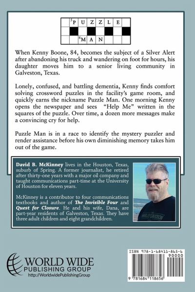 When Kenny Boone, 84, becomes the subject of a Silver Alert after abandoning his truck and wandering on foot for hours, his daughter moves him to a senior living community in Galveston, Texas. Lonely, confused, and battling dementia, Kenny finds comfort solving puzzles in the facility's game room, and quickly earns the nickname Puzzle Man. One morning Kenny opens the newspaper and sees "Help Me" written in the squares of the puzzle. Over time, a dozen more messages make a convincing cry for help. Puzzle Man is in a race to identify the mystery puzzler and render assistance before his own diminishing memory takes him out of the game.