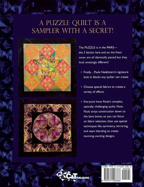 *Important Note about PRINT ON DEMAND Editions: The printing quality in this copy will vary from the original offset printing edition and may look more saturated due to printing on demand by a high-quality printer on uncoated (non-glossy) paper. The information presented in this version is the same as the most recent printed edition. Any pattern pullouts have been separated and presented as single pages. A Puzzle Quilt is a Sampler with a Secret! ¿ Finally...Paula Nadelstern's signature look in blocks any quilter can create ¿ Choose special fabrics to create a variety of effects ¿ The PUZZLE is in the PAIRS-identically pieced blocks look amazingly different! Everyone loves Paula's complex, optically challenging quilts. Now, Paula strips construction down to the bare bones, so you can focus on fabric selection, then use special techniques like symmetry, mirroring, and seam blending to create stunning, exciting designs. The six blocks are featured in a sampler, or combine them with your own ideas to create unlimited projects.