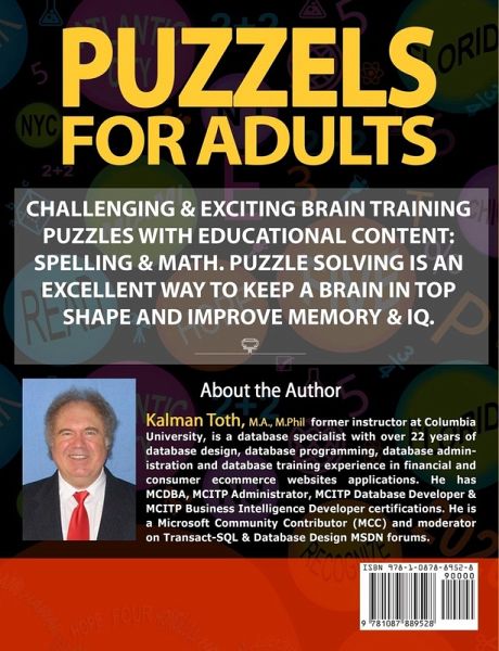 PERFECT BRAIN FITNESS HAPPY FUN GIFT FOR ANY OCCASION! Keep your brain young! Increase your IQ for success in business, work & love! The average God-given IQ of an adult is 150. The average effective (day-to-day) IQ is only 100-110. Medical science cannot yet increase the God-given IQ. However, we can increase the daily effective IQ by various mental activities among them puzzle solving. Put a puzzle in front of a child and watch what happens. It's amazing, really. With no explanation or modeling, the child will simply get to work, taking the puzzle apart and putting it back together piece by piece. Children are like this. They run, they jump, they seek out challenges and new experiences, and teach themselves by being playful and curious. At some point though, it's hard to say exactly when we stop playing. We exercise our bodies and our minds only when we have to, focusing on the results and dreading the process. I created this book of challenging puzzles to help adults return to that state of mind we generally associate with the very young: a place where learning is accomplished in a spirit of play, recreation, and adventure. I created this book because I believe that puzzles of all kinds, whether crosswords, anagrams, or Sudoku puzzles, can remind us to be curious and to see challenges as exciting rather than daunting. Though I've written many brain puzzles for children, this is specifically a book for those of us ages 18 and up. It's a book for the student seeking to improve his English or Math skills; as well as a book for the teacher trying to find new ways to connect her students with the material, or simply for the passenger on the bus; and anyone else who seeks entertaining ways to keep the mind moving and fit. After all, exercise isn't just about jumping jacks and free-weights. Both our bodies and our minds need and love exercise. Contrary to popular belief our brains are capable of growth (effective IQ) and change throughout our entire lives. It's easy to underestimate our minds, but so long as we are open to life-long learning as adults, our minds will continue to grow with us. Much has been made of the health benefits of doing complex puzzles. It's true that many studies have shown that individuals who regularly do crosswords and similar activities have improved memory, improved daily functioning, and less memory loss at advanced ages, as well as the delayed onset and reduced risk of conditions such as Alzheimer's Disease. That's all wonderful and is a large part of why I believe fun puzzles are so important, but people have been doing crosswords for far longer than doctors have been prescribing them. The reason for this is simple. We find them enjoyable. My hope for all those who read this book is foremost that you achieve your educational goals, whether you're trying to improve your spelling by decoding anagrams; sharpen your math skills with multiple operation problems; or hone your sense of detail and analysis by finding the difference between two images in a picture puzzle. But even more than this I hope that you become (if you are not already) a lover of puzzles because to be a lover of puzzles is to be a lover of learning at any age. Go play. Live Life Active, Agile, Bright, Healthy & Happy!