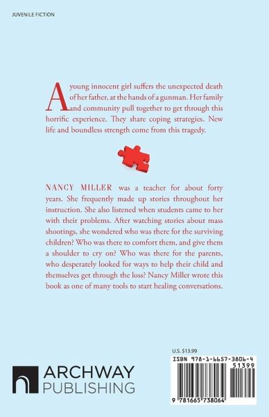 Nancy Miller was a teacher for about forty years. She frequently made up stories throughout her instruction. She also listened when students came to her with their problems. After watching stories about mass shootings, she wondered who was there for the surviving children? Who was there to comfort them, and give them a shoulder to cry on? Who was there for the parents, who desperately looked for ways to help their child and themselves get through the loss? Nancy Miller wrote this book as one of many tools to start healing conversations.
