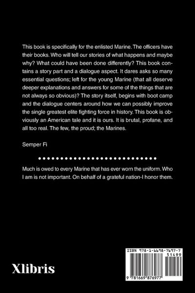 This book is specifically for the enlisted Marine. The officers have their books. Who will tell our stories of what happens and maybe why? What could have been done differently? This book contains a story part and a dialogue aspect. It dares asks so many essential questions; left for the young Marine (that all deserve deeper explanations and answers for some of the things that are not always so obvious)? The story itself, begins with boot camp and the dialogue centers around how we can possibly improve the single greatest elite fighting force in history. This book is obviously an American tale and it is ours. It is brutal, profane, and all too real. The few, the proud; the Marines. Semper Fi