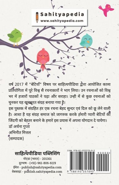 In 2017, Sahityapedia organized a Hindi Poetry Competition on the topic "Daughters" in which hundreds of authors from across the globe submitted their poems. These poems were read, reviewed and liked by lakhs of readers globally. The winners of the competition were awarded cash prizes. Then Sahityapedia published a beautiful Kavya Sangrah comprising of poems selected from the entries of the competition. "Pyaari Betiyaan" is a beautiful collection of 187 poems on the topic 'Daughters' penned by 187 authors from across the globe.